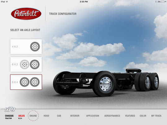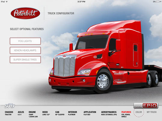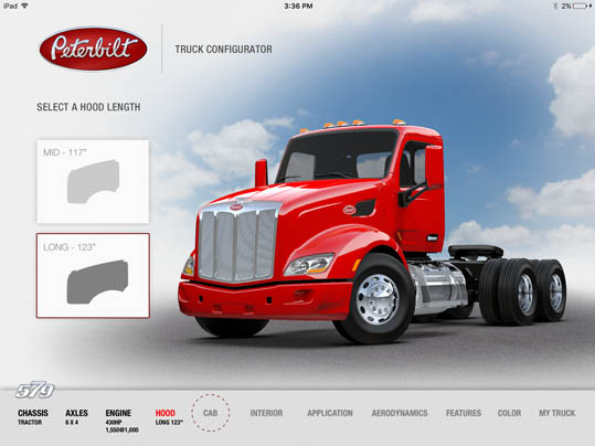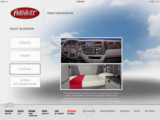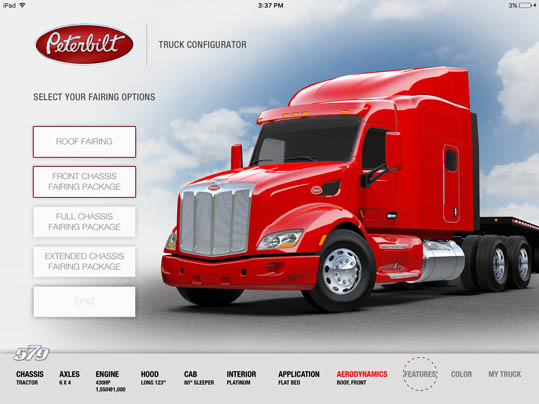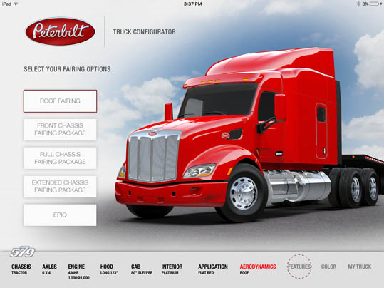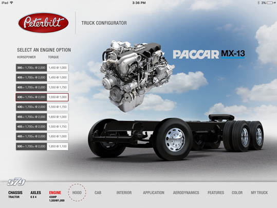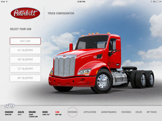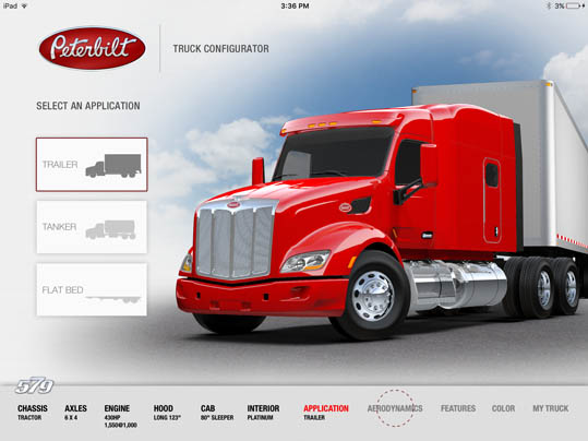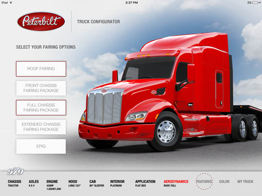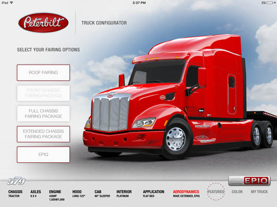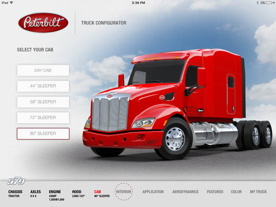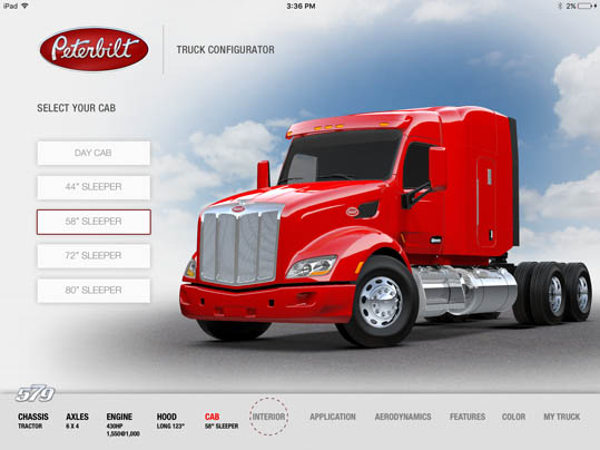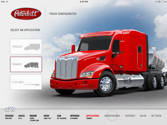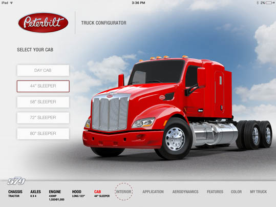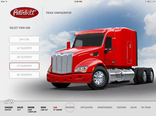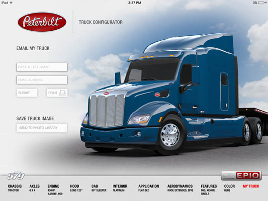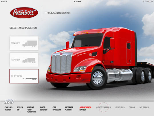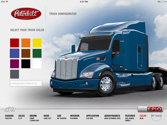 LaDriere, the Bloomfield Hills, MI based digital art studio announces the launch of the Peterbilt 579 Truck Configurator app. This is the second business iPad application for marketing and advertising purposes that the studio has developed.